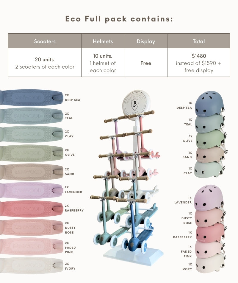This pack Includes 2 scootes of each color and 1 helmet of each color from the ECO series